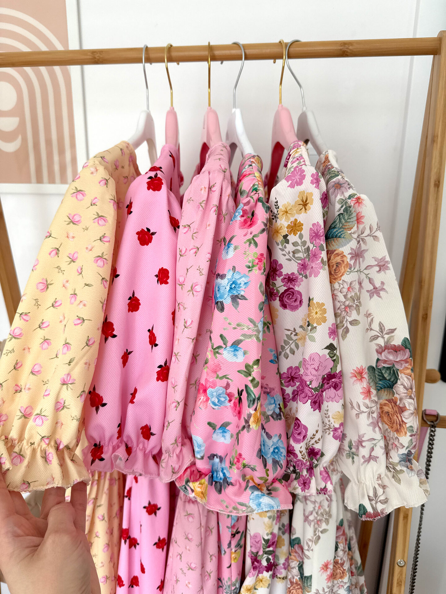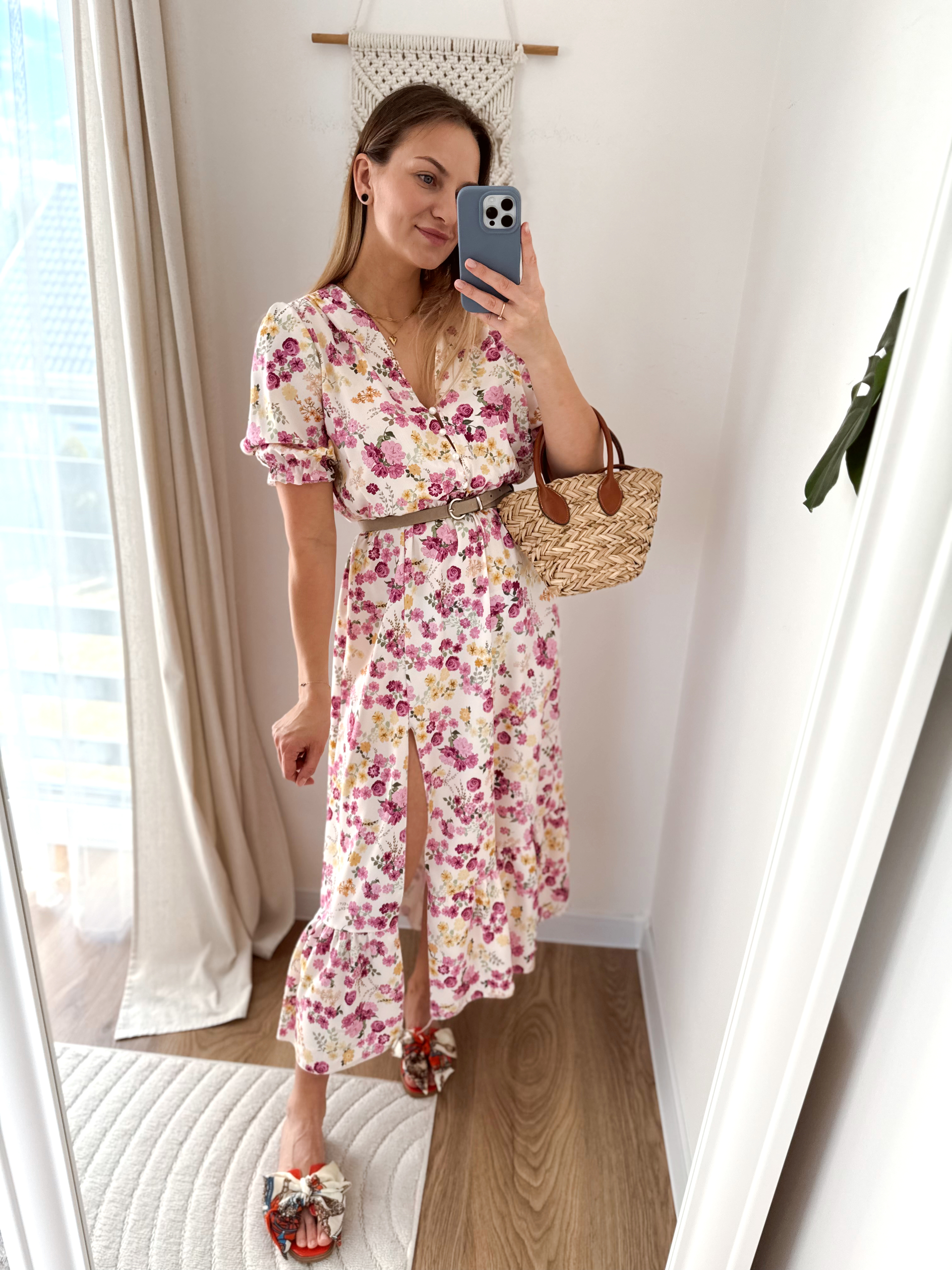 Sukienka midi z krótkim rękawkiem zakończonym gumką. Posiada rozporek, w miejscu paska gumka.