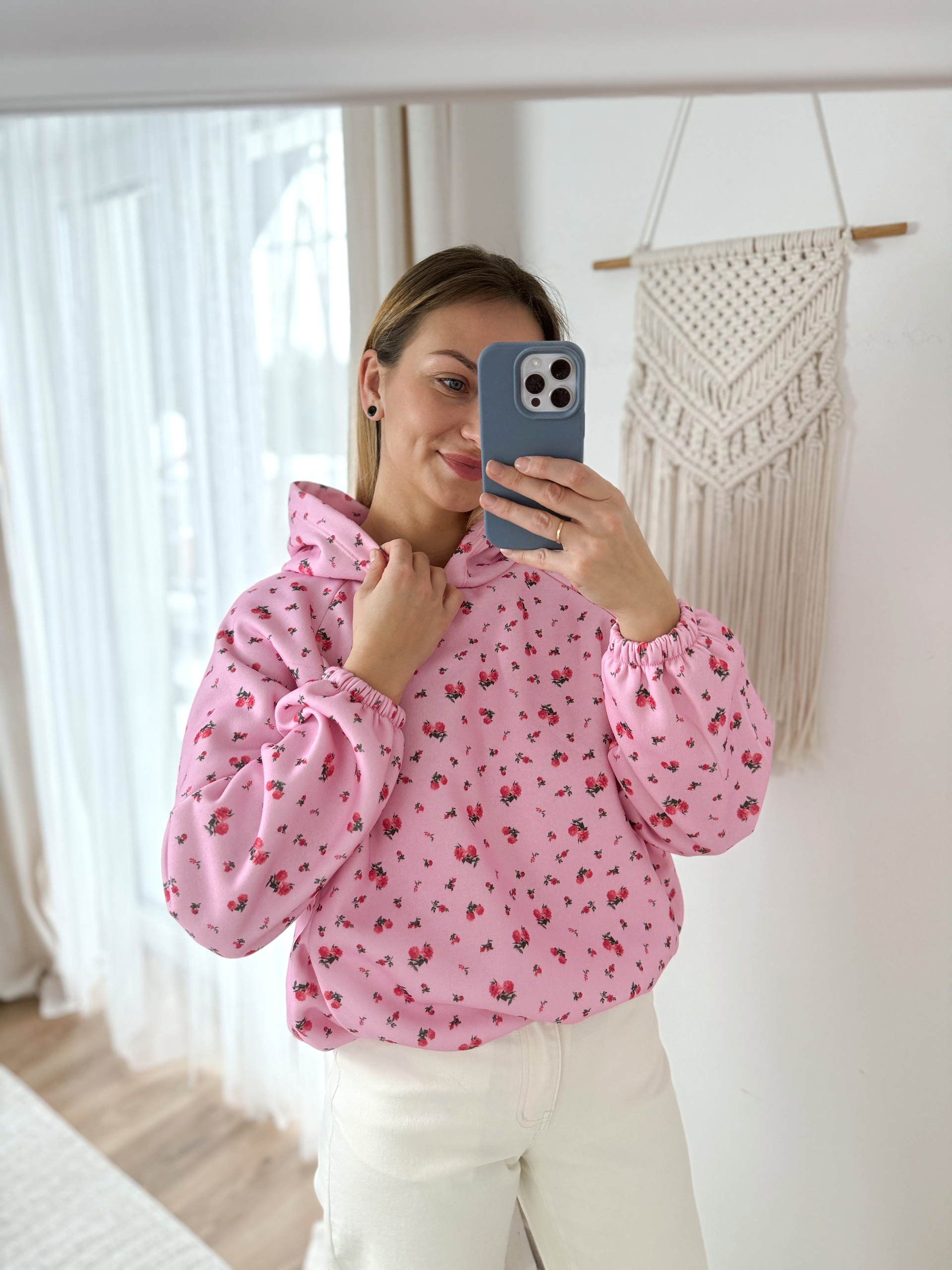 Bawełniana bluza z kapturem. Ocieplana. Rękawy i pas zakończone ghumką. Na przodzie posiada ukryte kieszonki.
