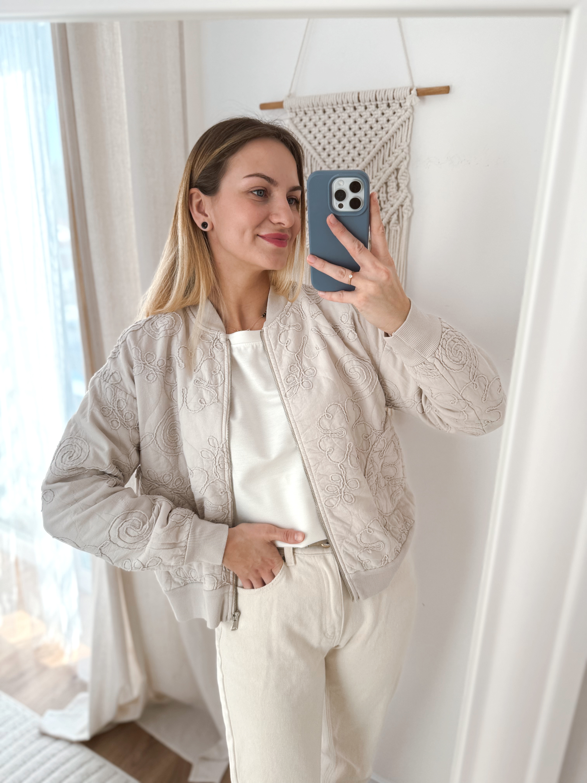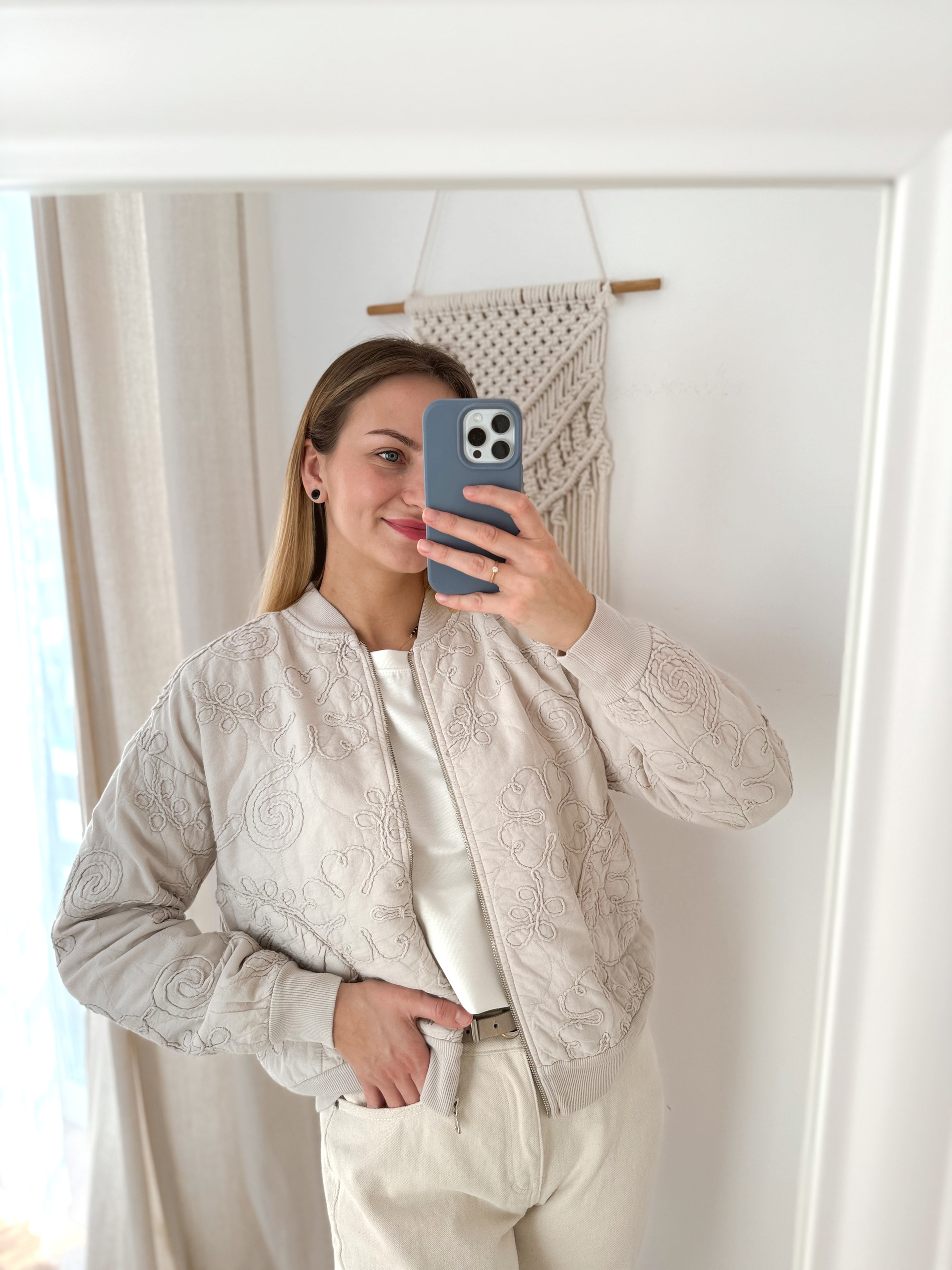 Bawełniana bomberka na zamek, rękawy i dół kutki zakończone ściągaczem.