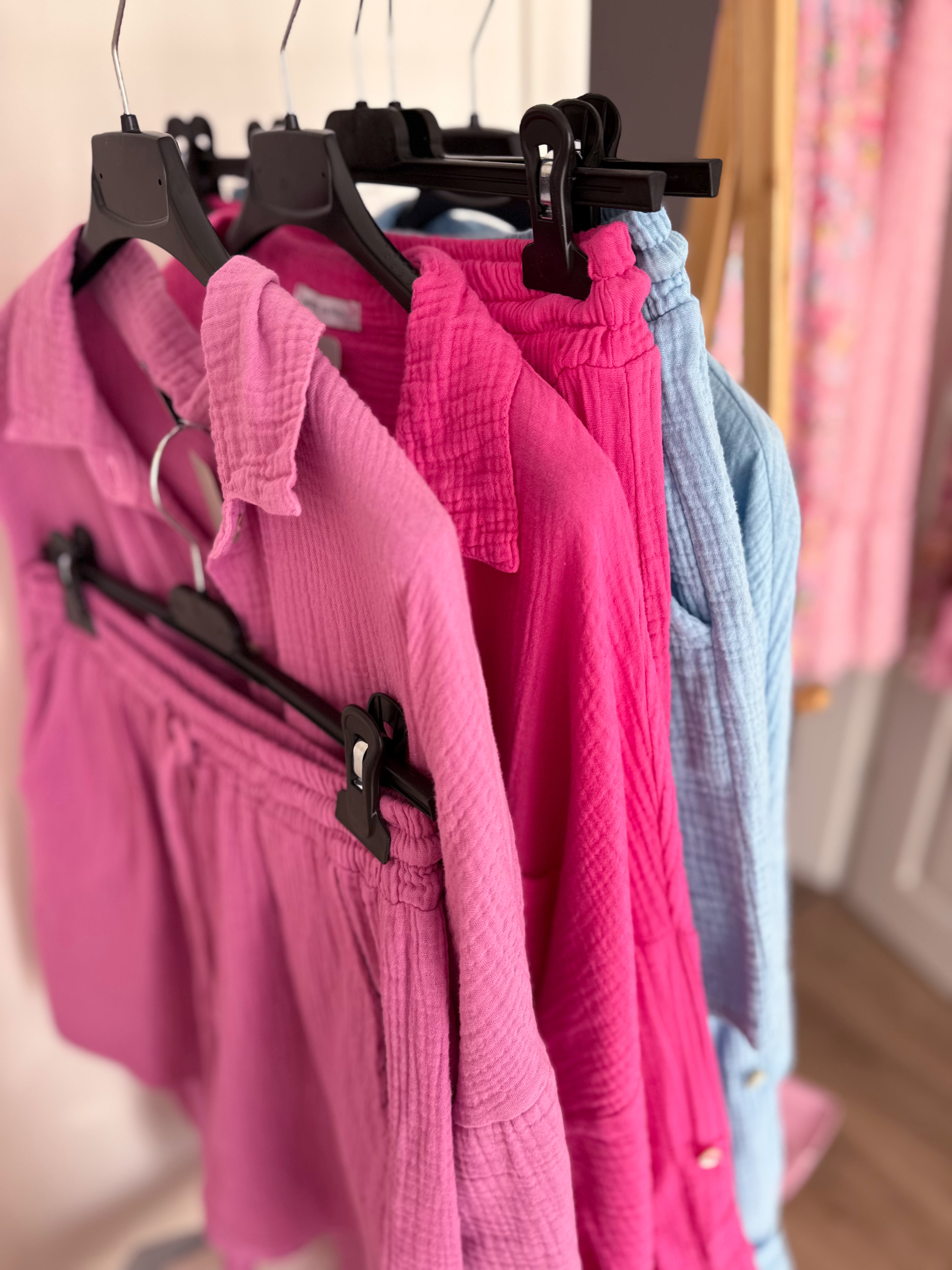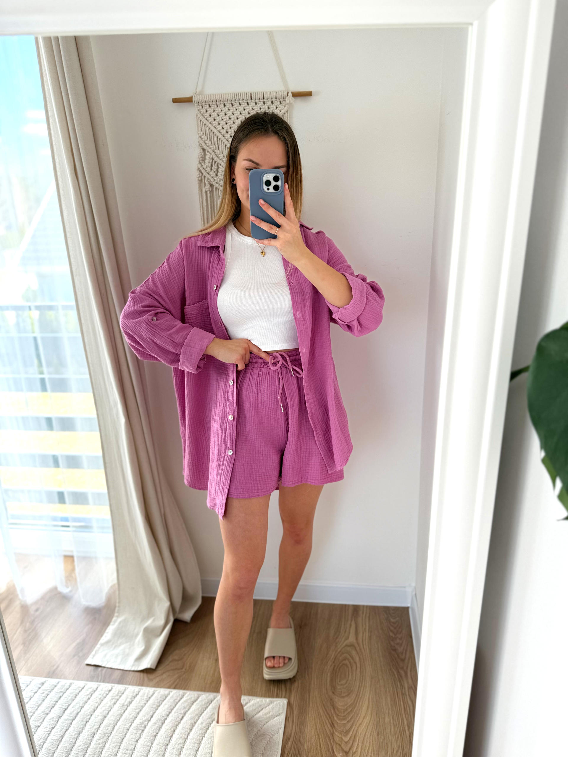 Komplet składa się z długiej koszuli i szortów na gumce z wiązaniem.