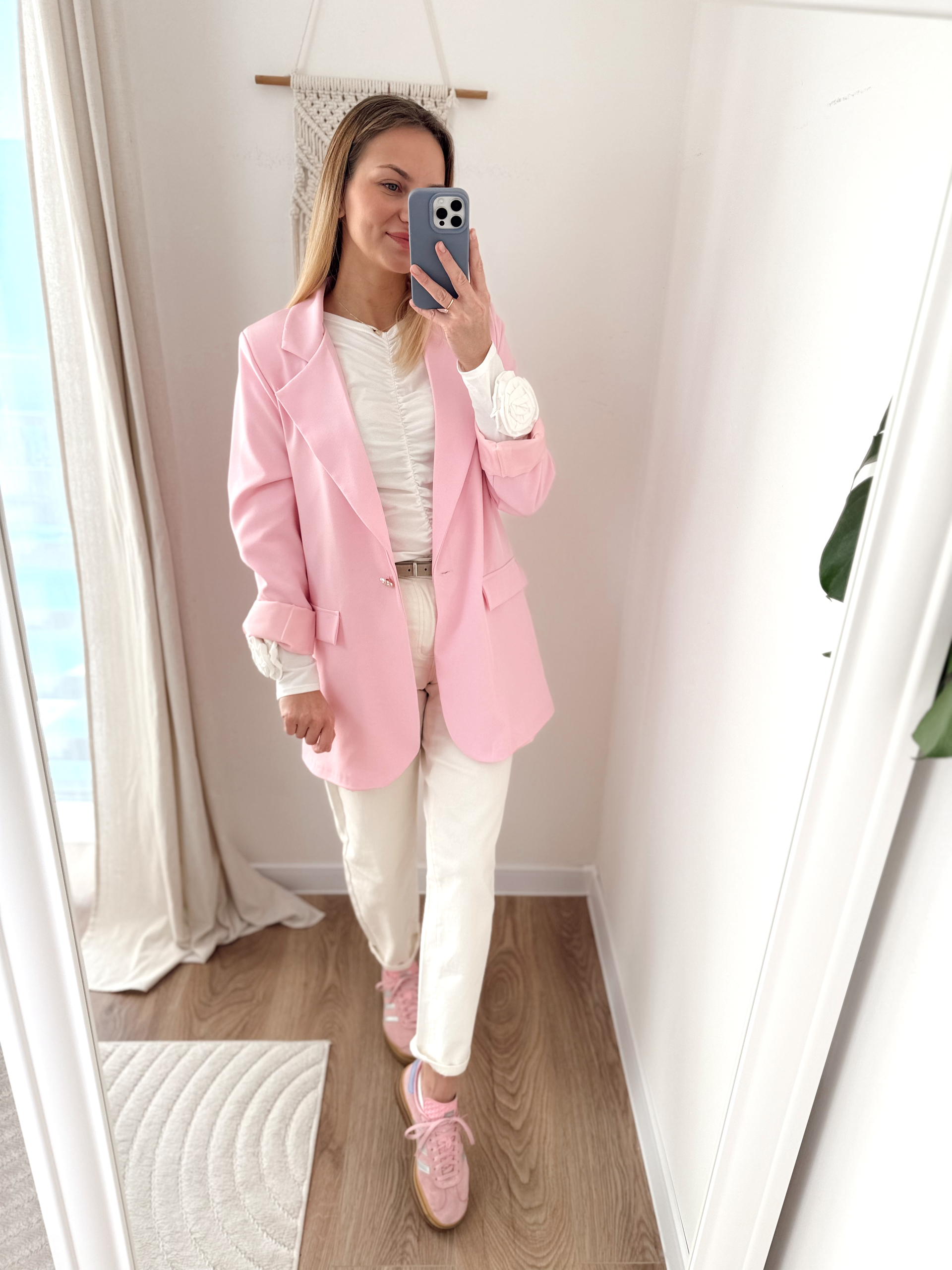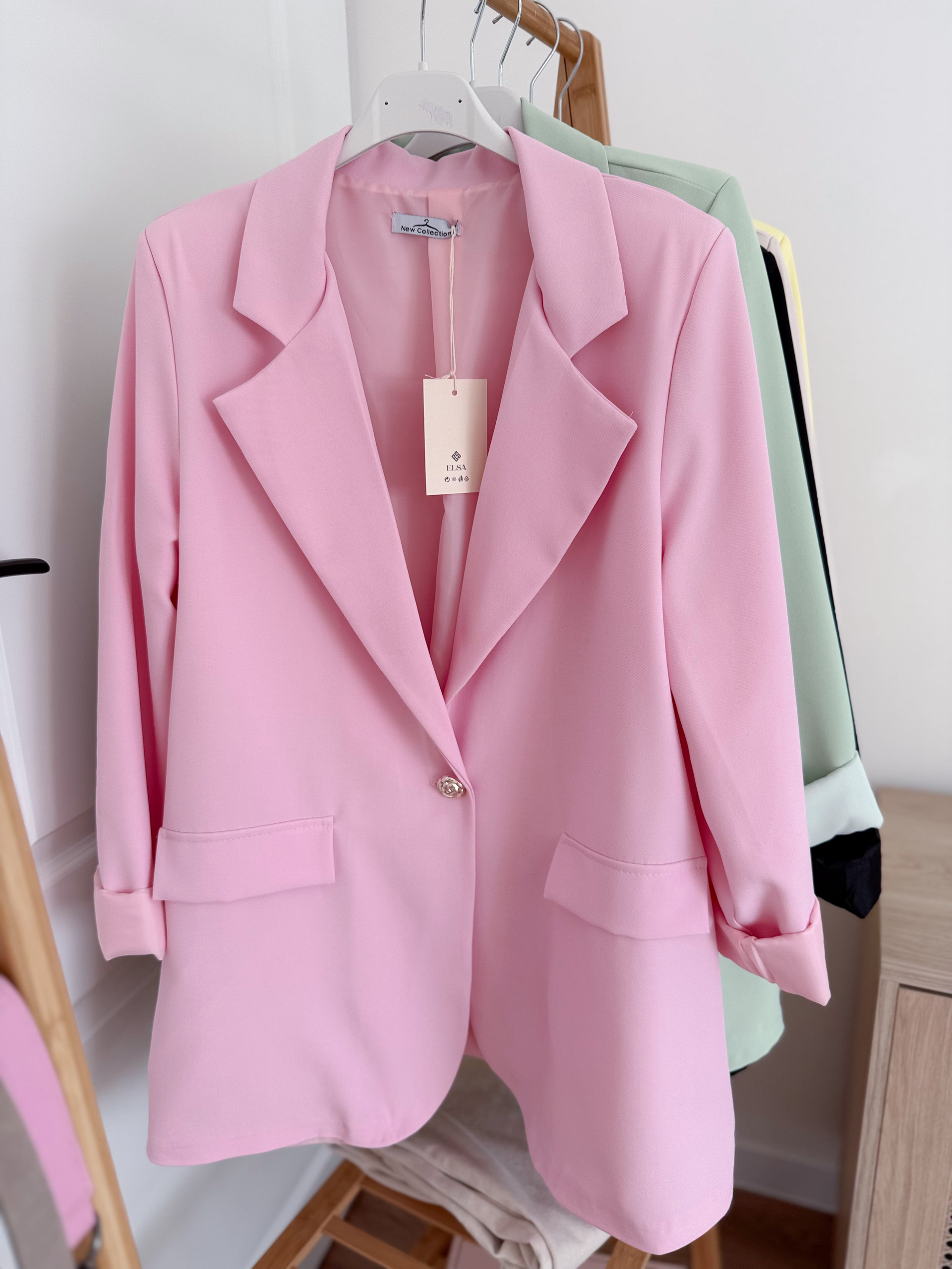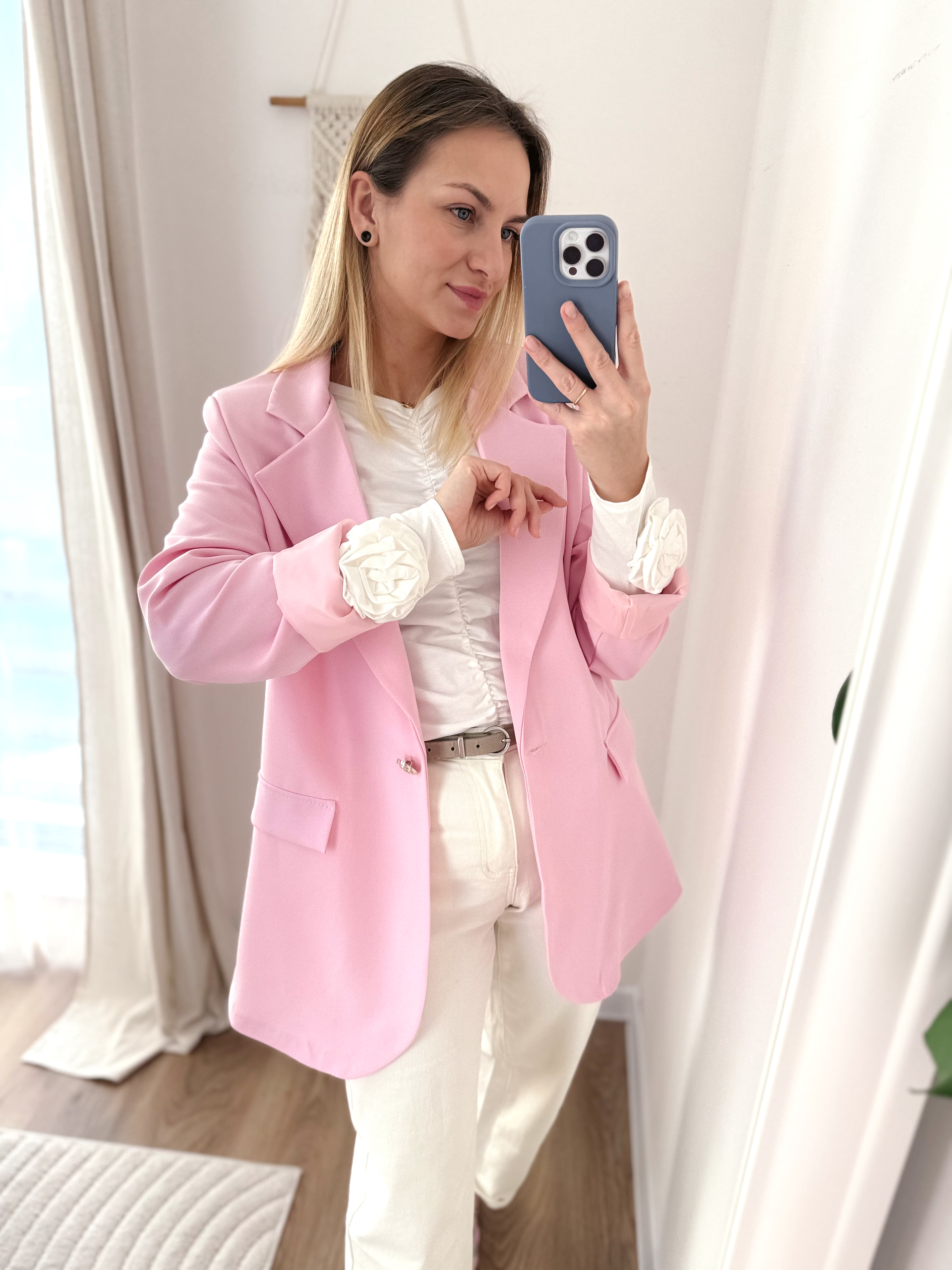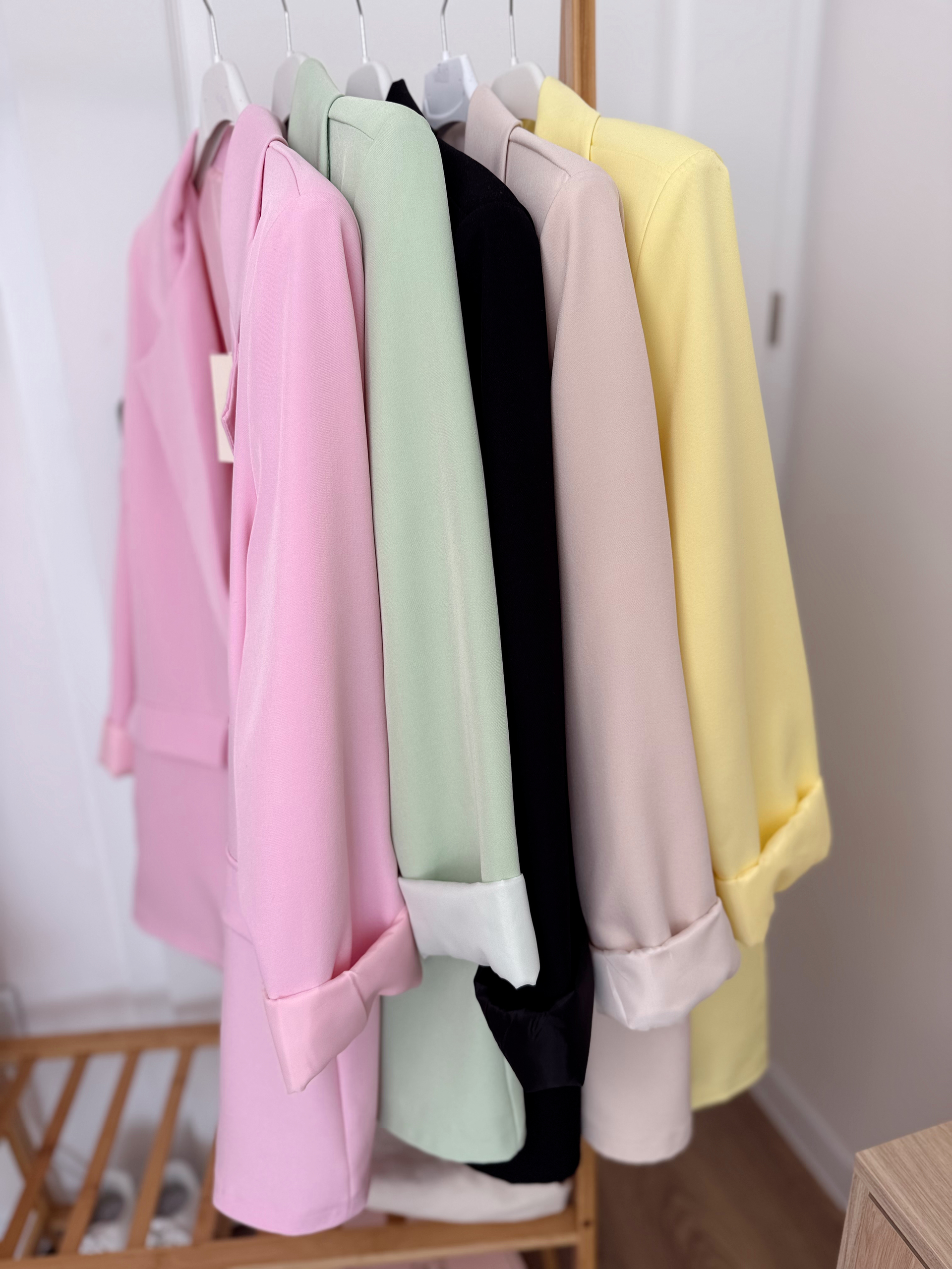 Marynarka o dłuższym kroju. Posiada poduszeczki w ramionach i podszewkę. Zapinana na jeden guzik w kształcie kwiatka.