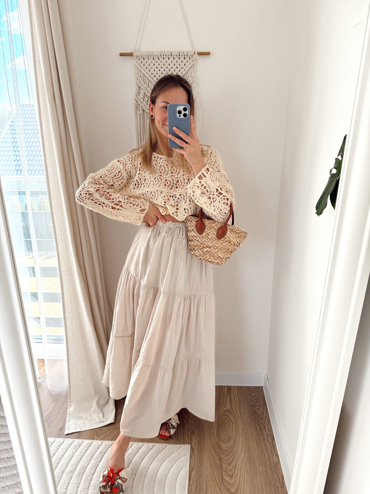 Spódnica maksi na gumce. Mocno rozkloszowana, materiał leciutki, cieńszy. Posiada krótką podszewkę. Sznureczek ozdobny.