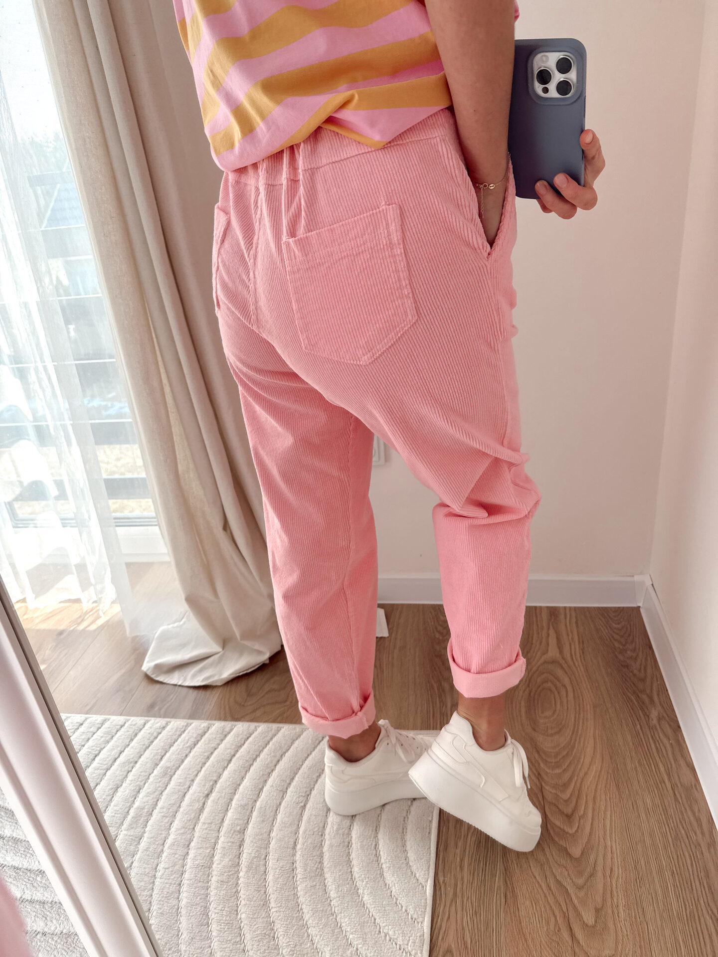 Bawełniane spodnie z paskiem w zestawie. Posiadają kieszonki tył i przód.
