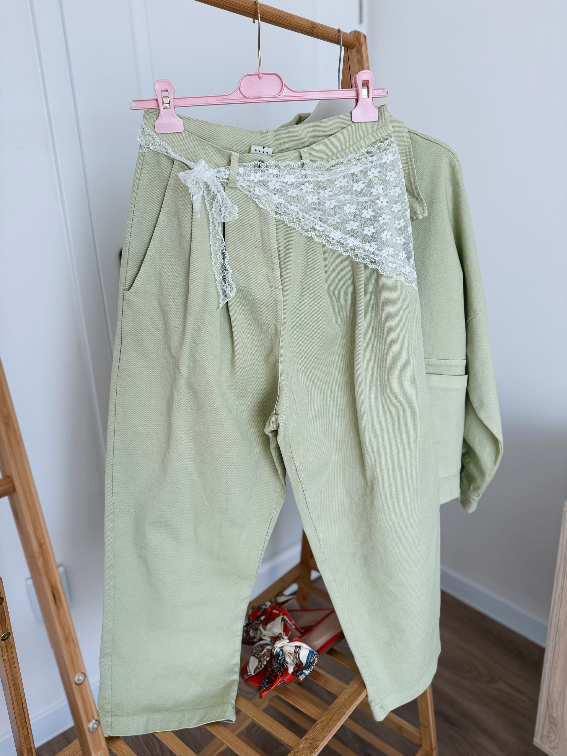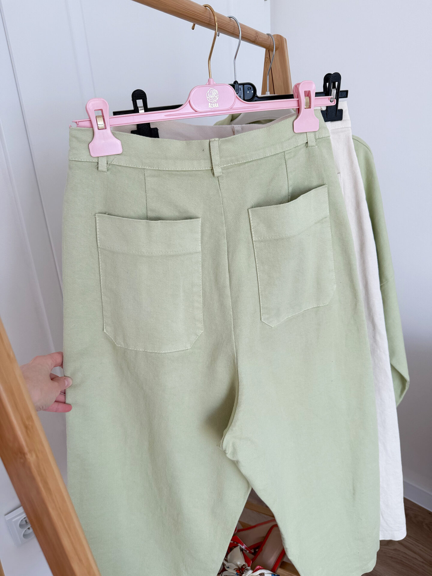 Spodnie z szerszą nogawką i mocno wysokim stanem.