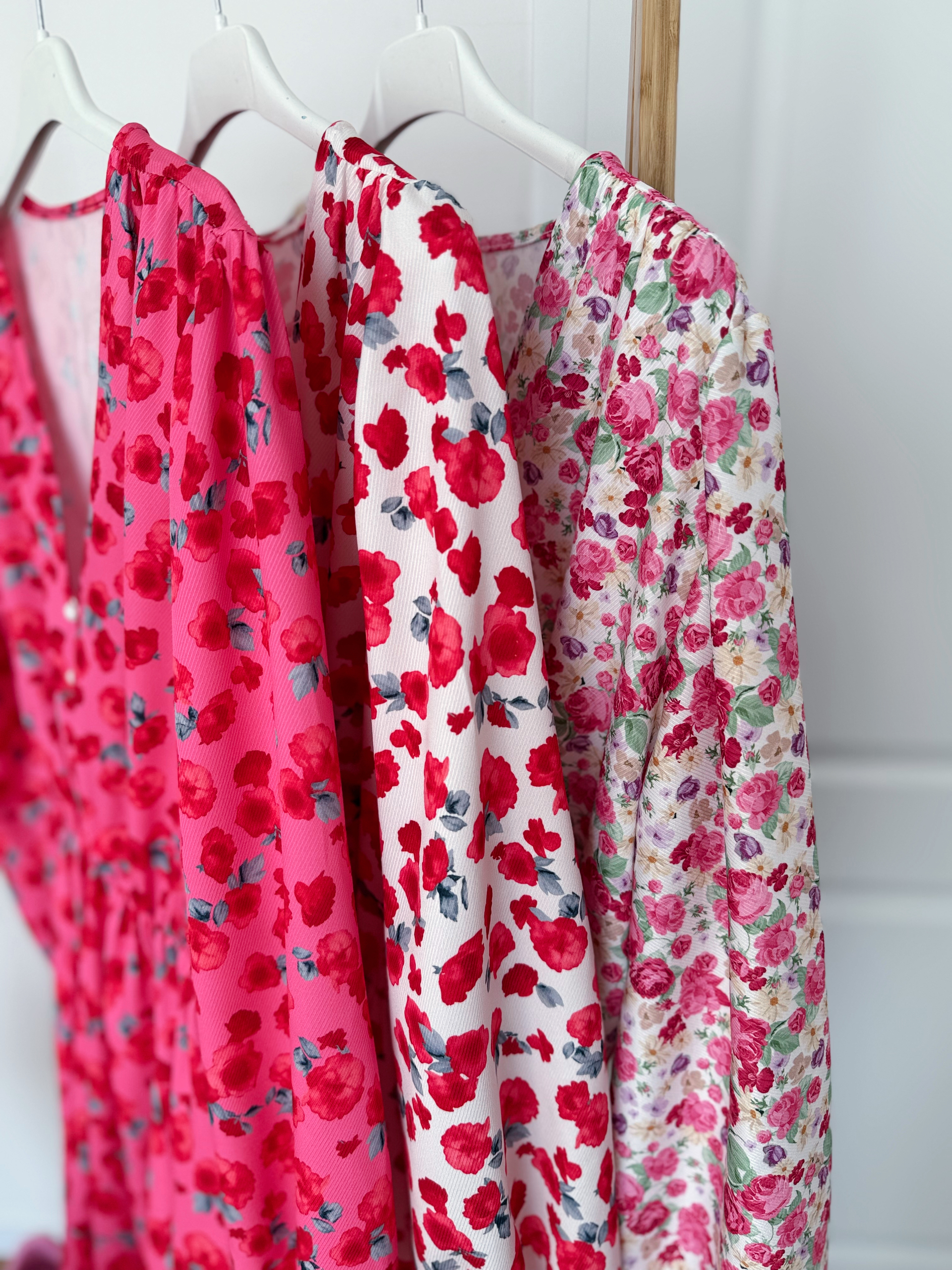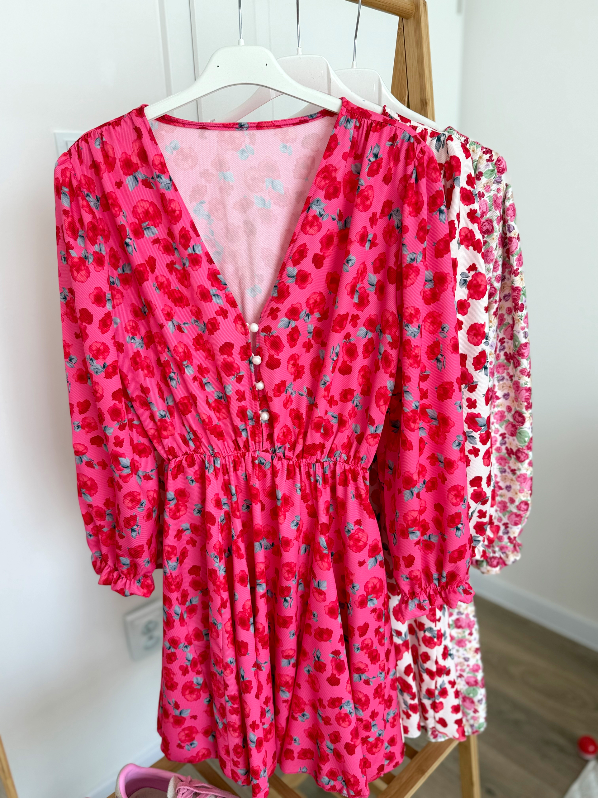 Sukienka w kwiatki, w biuście zapinana na guziczki. W pasie i nadgarstku gumka. Dół mocno rozkloszowany.