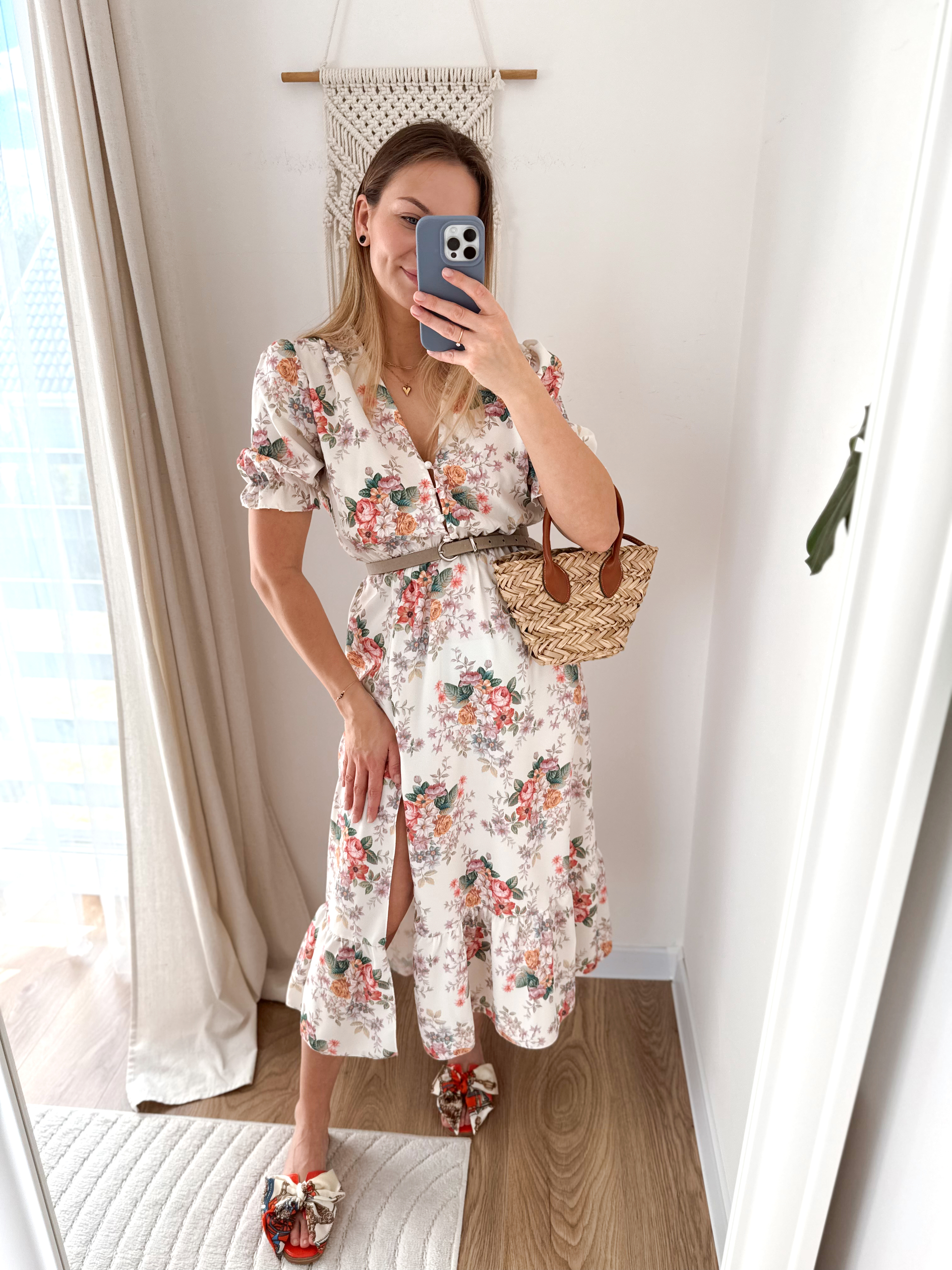 Sukienka midi z krótkim rękawkiem zakończonym gumką. Posiada rozporek, w miejscu paska gumka.