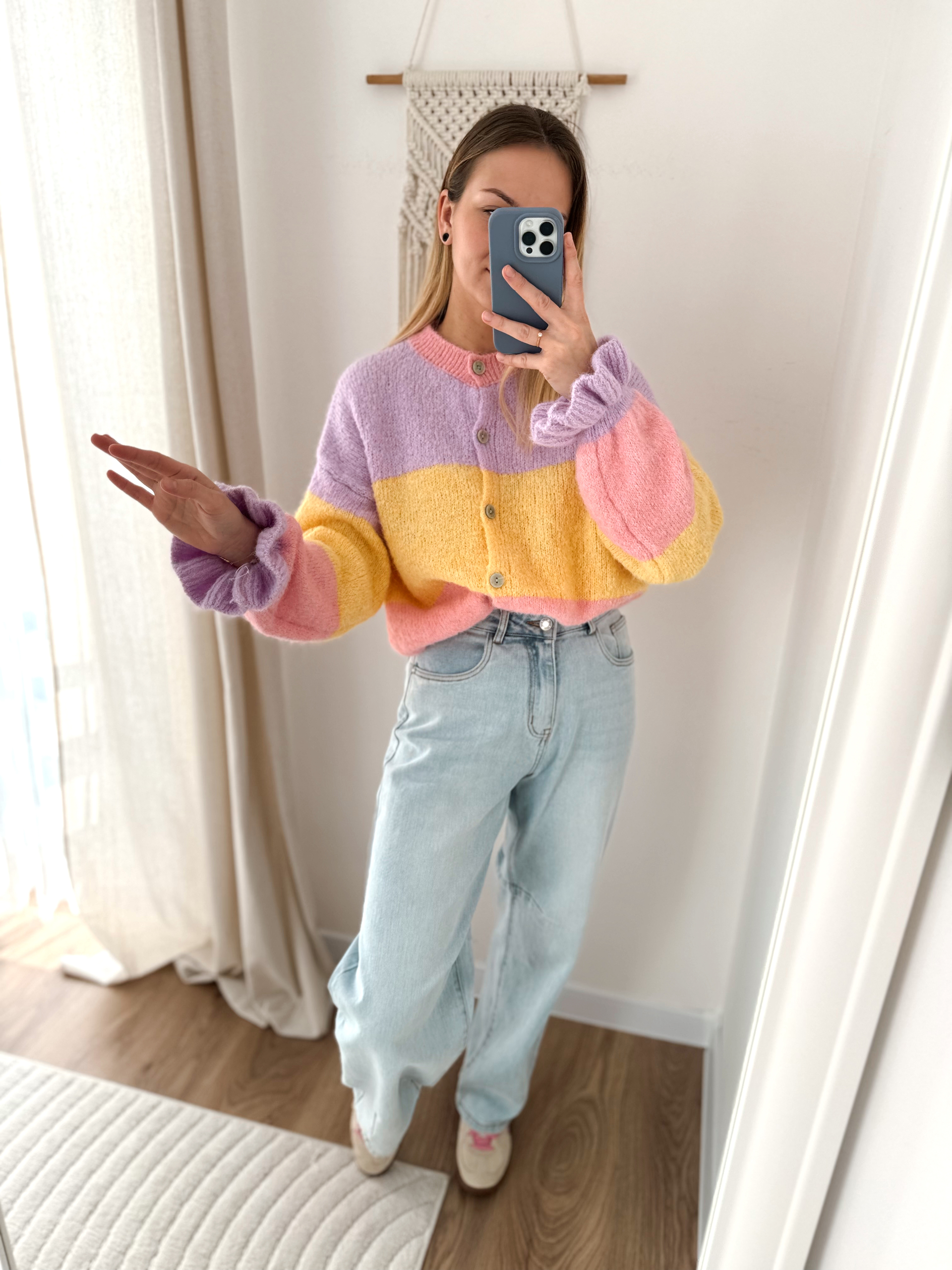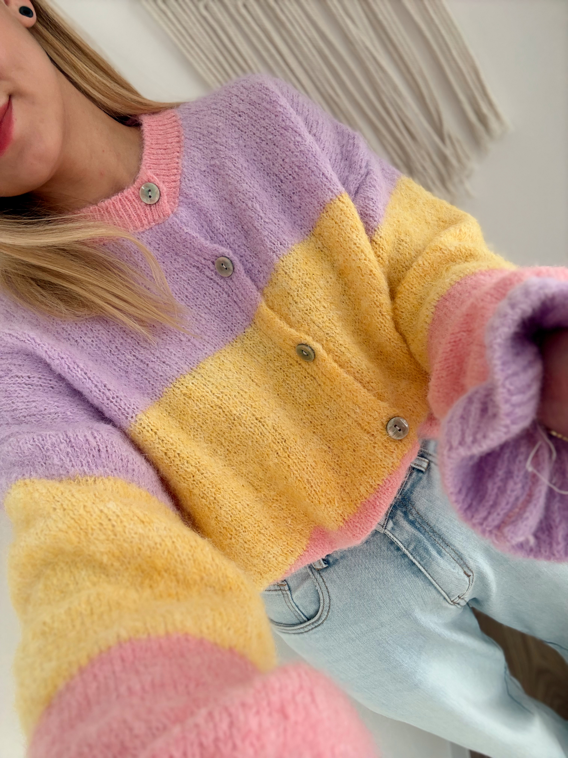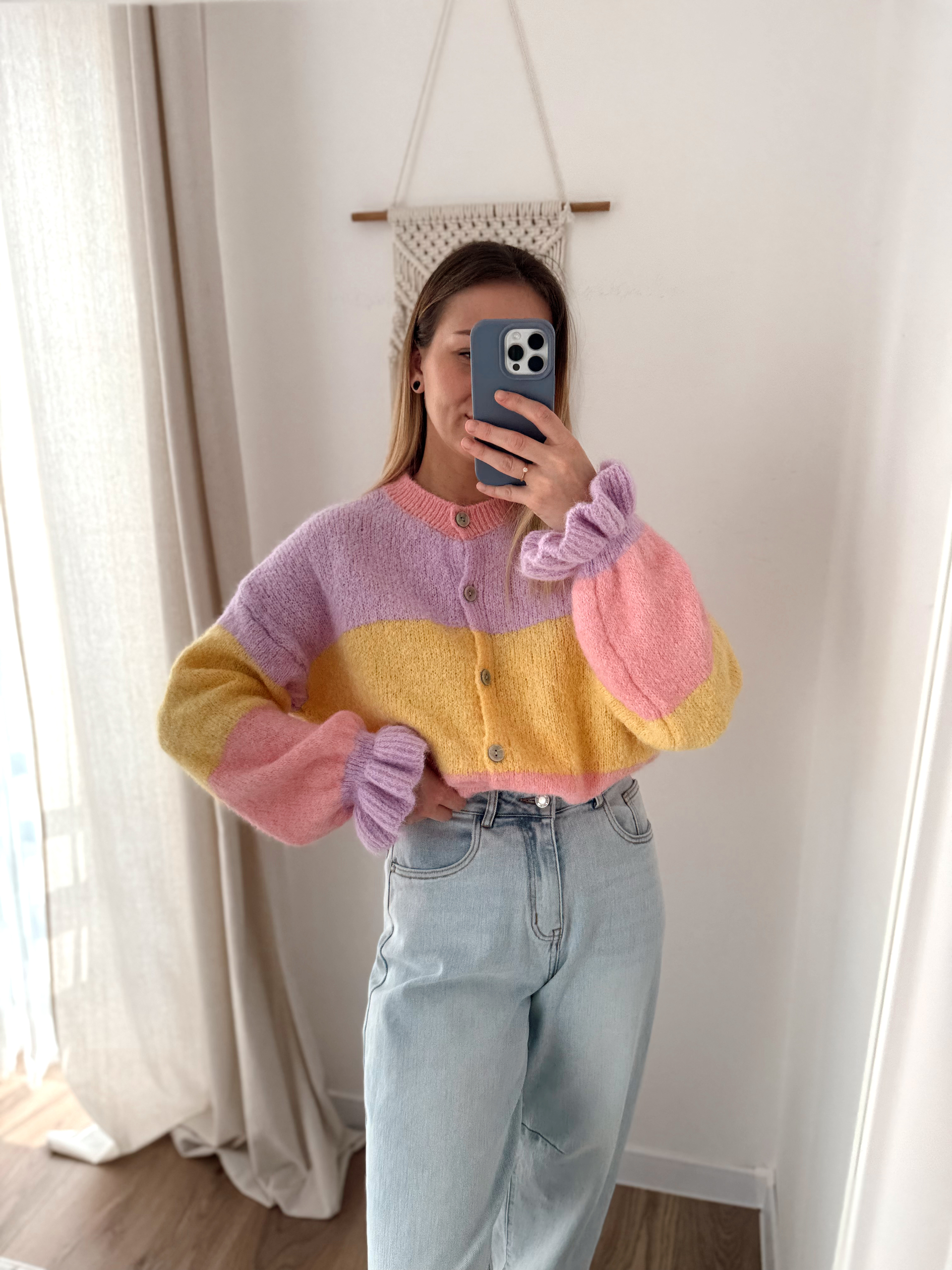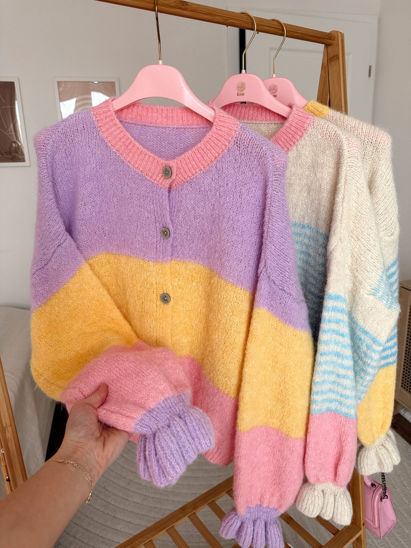 Sweterek zapinany na guziczki. Rękawy wykończone falbanką.