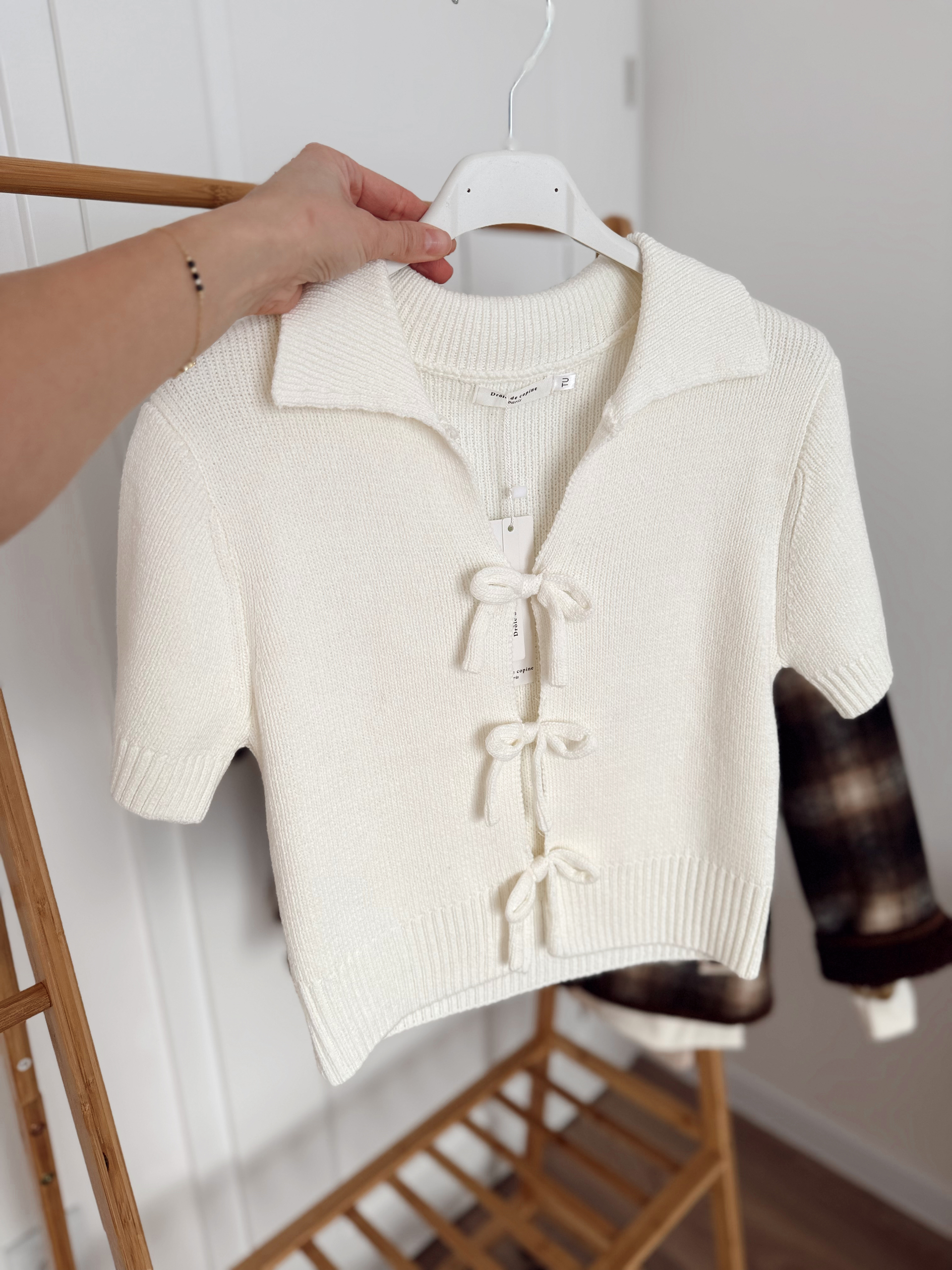 Top dzianinowy z kołnierzykiem i ozdobnymi kokardkami (nie odwiązują się). Sprawdzi się do letnich stylizacji – np. jeansowych szortów, ale także na elegancko.